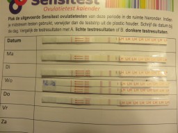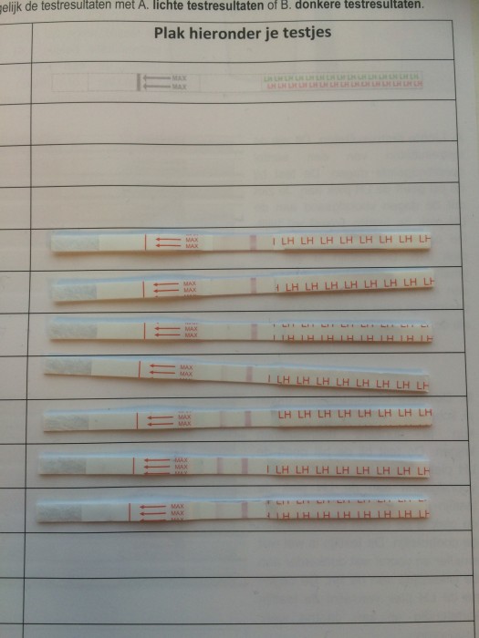 "Ik heb deze week ovulatietesten gedaan. Ik neem aan dat ik op woensdag mijn LH-piek had, de eerste test van woensdag was rond 12.30 uur, de 2e in de avond (21 uur of zo, weet het niet meer precies). Zou ik ervan uit kunnen gaan dát er een ovulatie geweest is, want een donkerdere teststreep dan de controlestreep heb ik niet gevonden!? Maar ik denk dat je dan gewoon ervan uit kunt gaan dat het ergens op woensdag was?"