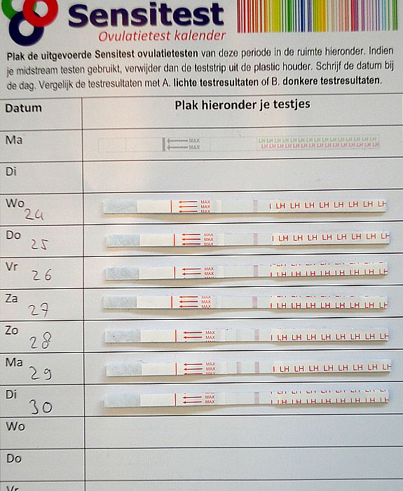 "Dat ging erg makkelijk. Een dikke streep op de 29e. Een duidelijke LH piek en daarvoor eigenlijk niets. Dit zijn hele fijne ovulatietesten."