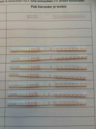 Onze reactie: "Dit is een prima testresultaat. De aanhouder wint. De een na laatste ovulatietest is beduidend donkerder dan de andere testen en geeft zo mooi je vruchtbare dag aan. Soms moet je wat langer doorgaan met testen om je LH piek te vinden, en dat is bij jou heel goed gelukt."