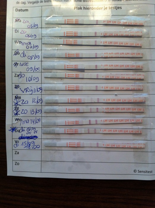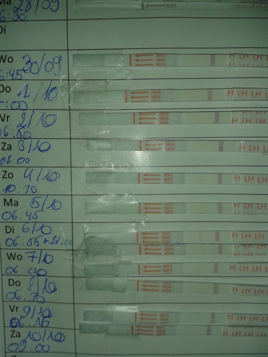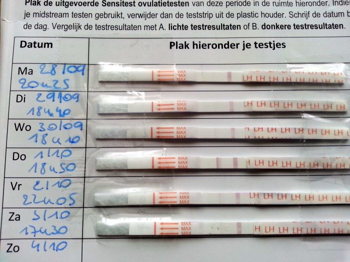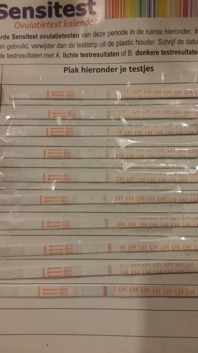 "Bijna 2 jaar wachten wij in volle spanning op de komst van ons eerste kindje. Lang heb ik de boot afgehouden maar vorige maand dan toch beslist om van start te gaan met de ovulatietest. Mijn cyclus varieert tussen de 28 en 35 dagen.Toch is er nog twijfel en weet ik niet zeker of mijn ovulatie op 6/10 heeft plaatsgevonden? Er is een heel licht streepje te zien en nadien niets meer. Misschien is de concentratie LH in mijn urine zeer klein?"