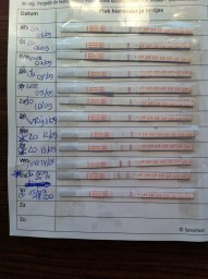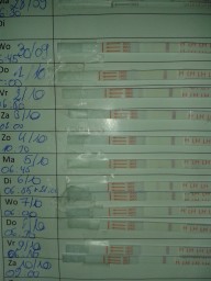 "Sinds ik begin dit jaar gestopt ben met de pil, heb ik altijd een cyclus van rond de 40 - 44 dagen. Het is niet altijd even makkelijk om mijn vruchtbare dagen te vinden. Nu had ik een goed zichtbaar 2de streepje op de ovulatietest op 1/10. Ik denk toch dat die positief was? De dagen erna was er bijna niks meer te zien op de test. Ik had ook last van wat krampjes en steken in mijn onderbuik. "