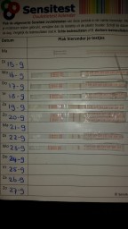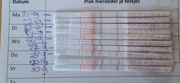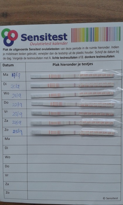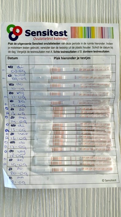 "Mijn cyclus is onregelmatig, dus besloten toch maar ovulatietesten te gebruiken. Ik denk zeg 16 of 17 september.