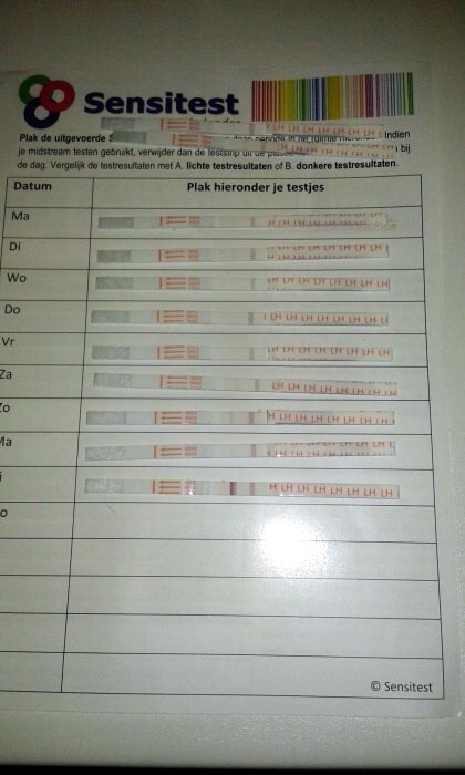 "de voorbije dagen waren de testen alleen licht gekleurd tot vandaag in de tester van dag 16. 2 gelijk donker gekleurde strepen. POSITIEVE ovulatietest ? "