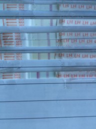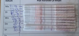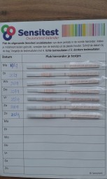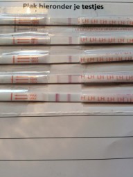 Onze reactie: "Zo te zien heb je de stripjes uit de ovulatietest gehaald. Zo kun je de testlijntjes nog beter zien en vergelijken. De laatste ovulatietest, nog in de houder, is zeker positief. Je hebt je LH piek gevonden. Prima resultaat. Over 2 weken kun je een betrouwbare testuitslag op je zwangerschapstest verwachten. Succes!"