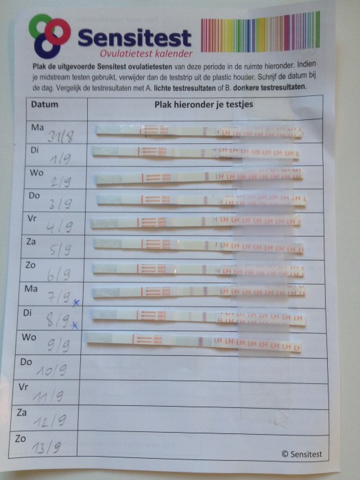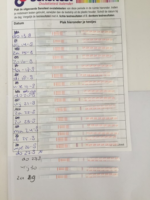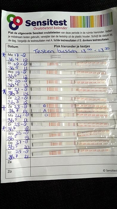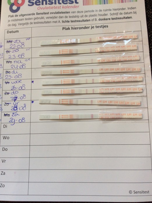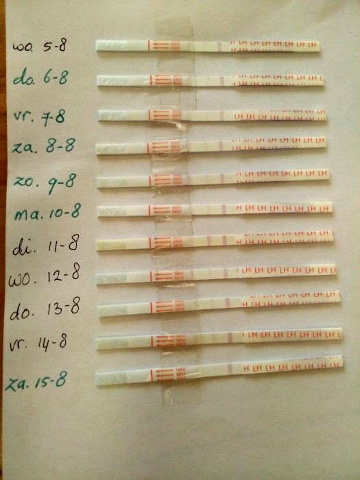 Onze reactie: "Als je je ovulatietesten netjes inplakt kun je ze ook meenemen naar een arts of gynaecoloog om de testresultaten te bekijken. In jouw geval is dat goed gelukt. Je hebt bovendien mooie duidelijke testjes. Op 25 augustus de dag dat je de grootste kans hebt op zwangerschap. Heel veel succes ermee."