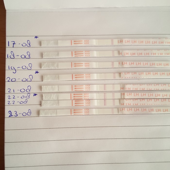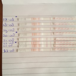 "Op 21 en 22 aug een duidelijke 2e streep te zien. Beiden even donker, wat is nu mijn LH piek? Op 21 aug duurde het lang voordat de streep verscheen, op 22 aug slechts enkele seconden. "