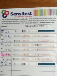 "Onze eerste maand proberen en gelijk op verzoek van vriendinnen de sensitests gekocht. Zoals je ziet even een negatieve zwangerschapstest om vergelijkings materiaal te hebben, daarna 6 dagen de ovulatietest gedaan, daar zie je dus dag 14 een positieve test. Daarna helaas een negatieve zwangerschaptest, maar ja dit was de 1ste maand en even alles geprobeerd, handig spul en erg duidelijk!"