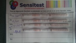 "Duidelijke piek op 11 augustus (2 tests). Dag erna bijna geen lijntje meer zichtbaar. Waarschijnlijk van 11 op 12 augustus eisprong gehad. Heb ook extra gevoelige tests gebruikt, maar had toen elke dag een dikke lijn. Voor mij dus te weinig onderscheidend. De gewone tests zijn voor mij dus het meest geschikt."