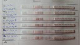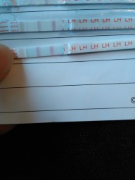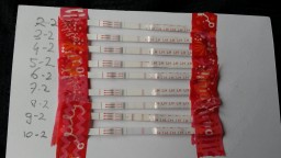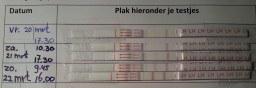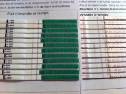 "Dit is niet de volledige foto van al mijn tests. De test gaf wisselend licht en donkerder streepje, dus werd er best onzeker van. Gelukkig wel een knalstreep op het goede moment."
