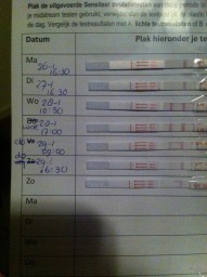 "Deze ronde (tweede maand) heb ik beide soorten tests tegelijkertijd gebruikt. Ik ben op zondagavond begonnen met één witte (minder gevoelige test). Vanaf maandag heb ik ook de groene (gevoeligere tests) gebruikt; steeds met dezelfde urine dus twee tests. Ik heb elke ochtend en elke avond getest. Hoewel beide testen een duidelijke piek laten zien (fijn!) stap ik vanaf nu over op de witte (tenzij ik zwanger blijk, natuurlijk). Bedankt Sensitest!"